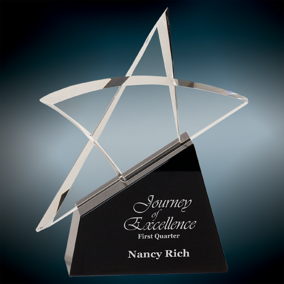 Our Premier Star Crystal is handmade and may vary slightly in size. Clear optic crystal outline star mounted to a black crystal base. Packaged individually in a lined gift box. Choose Premier Crystal to honor rising stars!